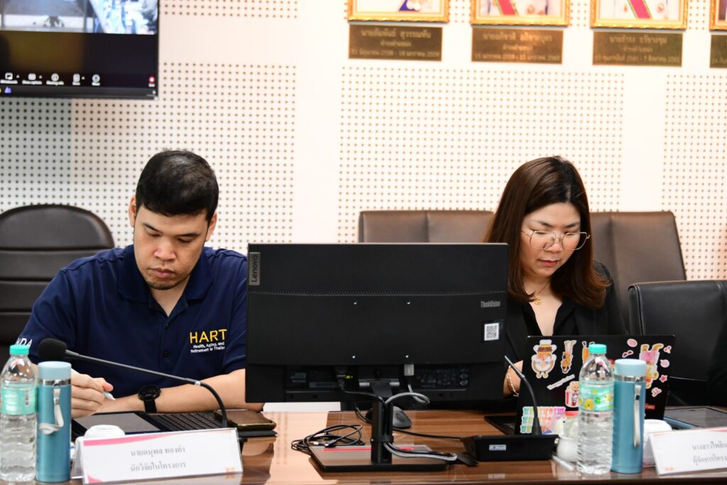 การหารือครั้งนี้ น.ส.ไพลิน เชื้อหยก ผู้จัดการโครงการ HART เป็นตัวแทนคณะผู้วิจัยนำเสนอข้อมูลวิจัยของโครงการที่ผ่านมา พันธมิตรเครือข่ายของโครงการวิจัยในต่างประเทศ และการนำข้อมูลโครงการ HART ไปใช้ในระดับนานาชาติ ทั้งนี้ทางผู้บริหารทั้งสองหน่วยงาน ยังได้ร่วมกันหารือแนวทางการใช้ข้อมูลงานวิจัยเพื่อสนับสนุนการพัฒนานโยบายและมาตรการรองรับสังคมสูงวัยในระดับชาติความร่วมมือด้านการพัฒนานโยบายและแผนงานผู้สูงอายุ อีกด้วย