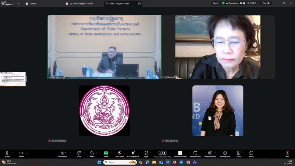 เมื่อวันที่ 6 กุมภาพันธ์ พ.ศ. 2569 เวลา 09.30 น. คุณจีราวรรณ บุญเพิ่ม และ คุณเมธินี เทพมณี ที่ปรึกษาคณะทำงานขับเคลื่อนโครงการสำรวจด้านสุขภาพ การสูงอายุ และการเกษียณในประเทศไทย (Health, Aging, and Retirement in Thailand : HART) นำ ศ.ดร.วิสาขา ภู่จินดา รองอธิการบดีฝ่ายวิจัยและบริการวิชาการ ผศ.ดร.ดารารัตน์ อานันทนะสุวงศ์ ผู้อำนวยการศูนย์วิจัยสังคมสูงอายุ และคณะนักวิจัยในโครงการ HART สถาบันบัณฑิตพัฒนบริหารศาตร์ เข้าพบ นายโชคชัย วิเชียรชัยยะ อธิบดีกรมกิจการผู้สูงอายุ เพื่อนำเสนอข้อมูลวิจัยในโครงการ โดยมีนางวรรณภา สุขคง รองอธิบดีกรมกิจการผู้สูงอายุ นางสาวสุชาดา อดทน ผู้อำนวยการกองยุทธศาสตร์และแผนงาน รวมถึงเจ้าหน้าที่ภายในกองต่างๆ ในสังกัดกรมกิจการผู้สูงอายุ ร่วมให้การต้อนรับ ณ ห้องประชุมโป๊ยเซียน 705 ทรัพย์เจริญสุข ชั้น 7 กรมกิจการผู้สูงอายุ กระทรวงการพัฒนาสังคมและความมั่นคงของมนุษย์
